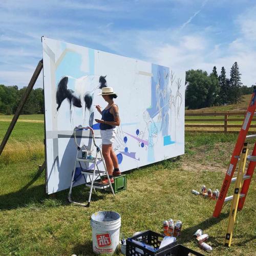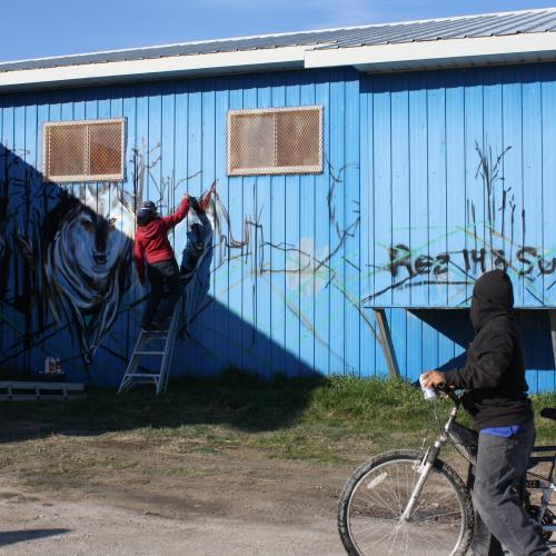 Past work, such as Parallel Route - a three-year Highway 17 mural project – has explored imagery reflective of the histories and stories of the Algoma area where they are located, offering visual food for thought for passers-by. Mississaugi River, one of the murals, exemplifies their typical context, scale and placement.