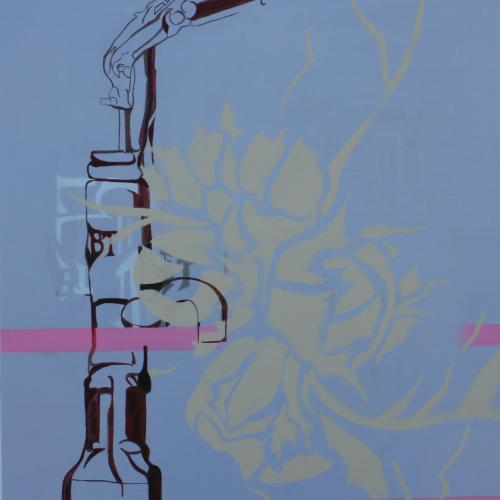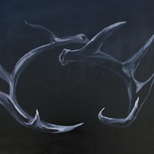 My recent work has visually represented the tension between natural systems and human-imposed structure. Blue City Wolf exemplifies this work: a wolf, penned in by layered, painted lines, is held captive. Here, the concept of ‘taming wilderness’ through constructed space – like that of a city - is evident.